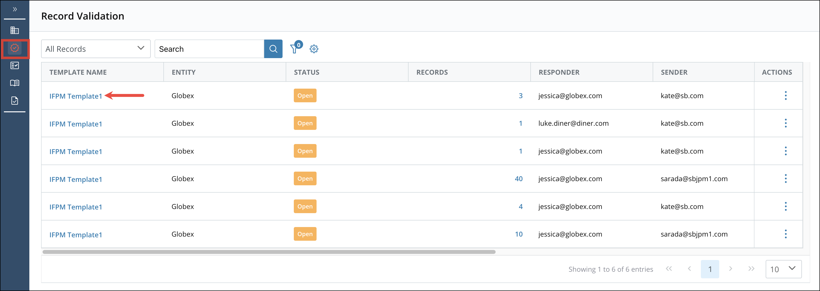 Navigate to the Record Validation Module and click on the template name to access the records.