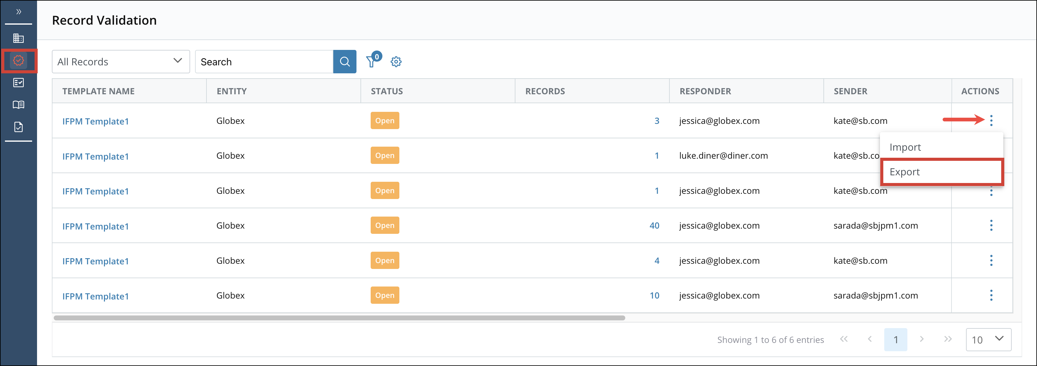 1. From the Record Validation Module, click on the 3 dots of the desired request and click Export.